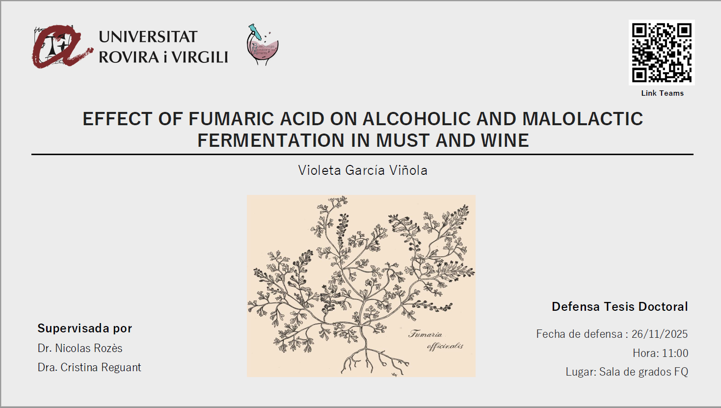 La Violeta presenta la seva tesi realitzada al grup Biotecnologia Microbiana dels Aliments (BMA Group), centrada en l'elaboració de vins de mínima intervenció, cada cop més demandats pels consumidors per motius ecològics i de salut. Aquests vins poden presentar defectes organolèptics, creixement no desitjat de bacteris làctics i inestabilitat microbiològica durant la fermentació. En aquest context, la Violeta estudia com l'àcid fumàric pot inhibir la fermentació malolàctica no desitjada, preservant la frescor i la qualitat del vi sense afectar els llevats responsables de la fermentació alcohòlica.