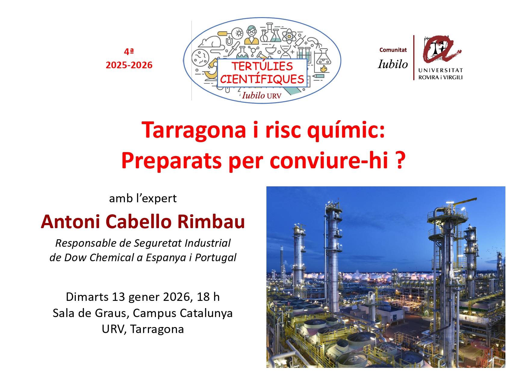 La Tertúlia Científica d'Iubilo URV dedicarà aquesta sessió a analitzar la gestió i convivència amb el risc químic a Tarragona, una zona amb una intensa presència industrial petroquímica. El ponent serà Antoni Cabello, enginyer químic de l'ETSEQ de la URV i responsable de Seguretat Industrial de Dow Chemical a Espanya i Portugal, amb 27 anys d'experiència en seguretat industrial i de processos.