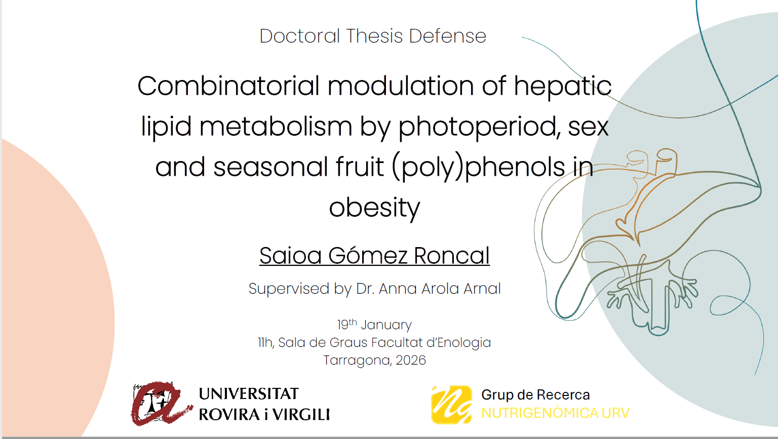 El dilluns 19 de gener, l'estudiant de doctorat del grup de Nutrigenòmica, Saioa Gómez Roncal, defensarà la tesi "Combinatorial modulation of hepatic lipid metabolism by photoperiod, sex and seasonal fruit (poly)phenols in obesity".