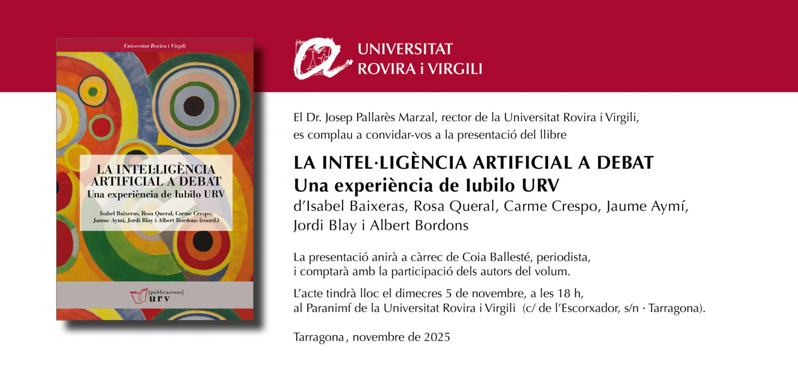 El rector de la URV, Dr. Josep Pallarès Marzal, y el coordinador del libro, Dr. Albert Bordons, os invitan al acto de presentación del volumen "La inteligencia artificial a debate: una experiencia de Iubilo URV".