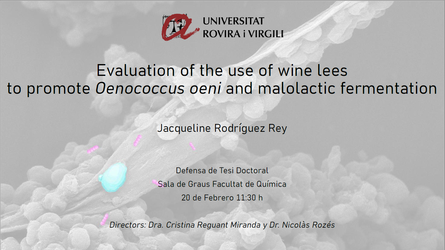 El próximo viernes 20 de febrero, la estudiante de doctorado Jaqueline Rodríguez del grupo presentará su tesis doctoral sobre bacterias lácticas, concretamente sobre Oenococcus oeni, bajo el título: "Evaluation of the use of wine lees to promote Oenococcus oeni and malolactic fermentation".